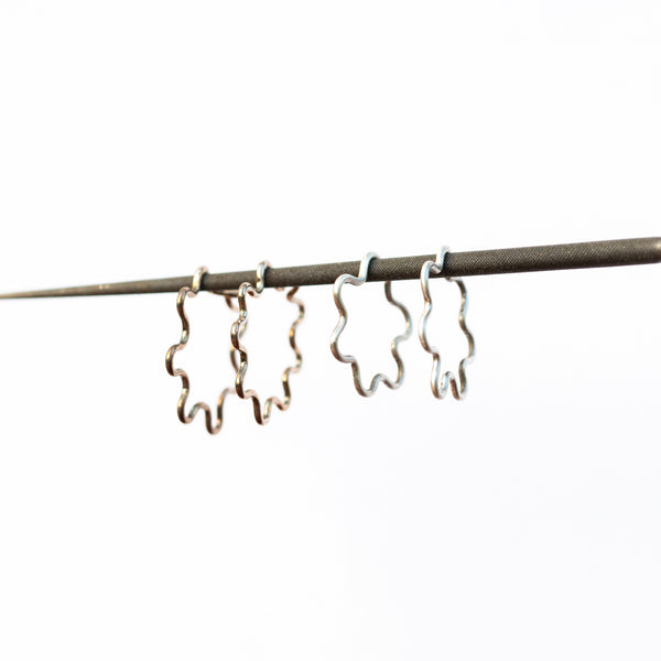 Argolas ondulados prateados numa haste fina contra um fundo branco