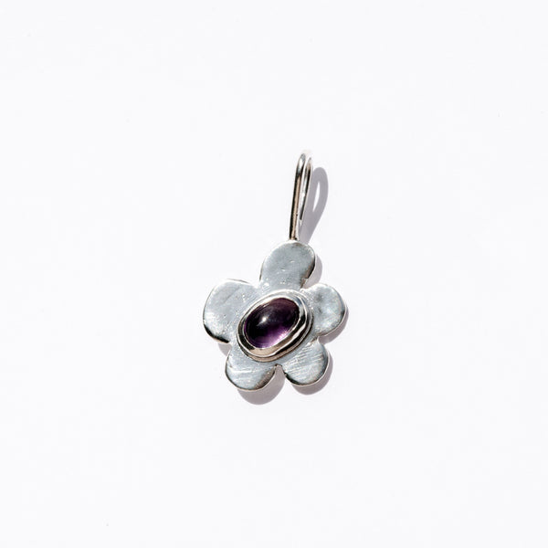 Silver flower-shaped pendant with an amethyst gemstone on a white background